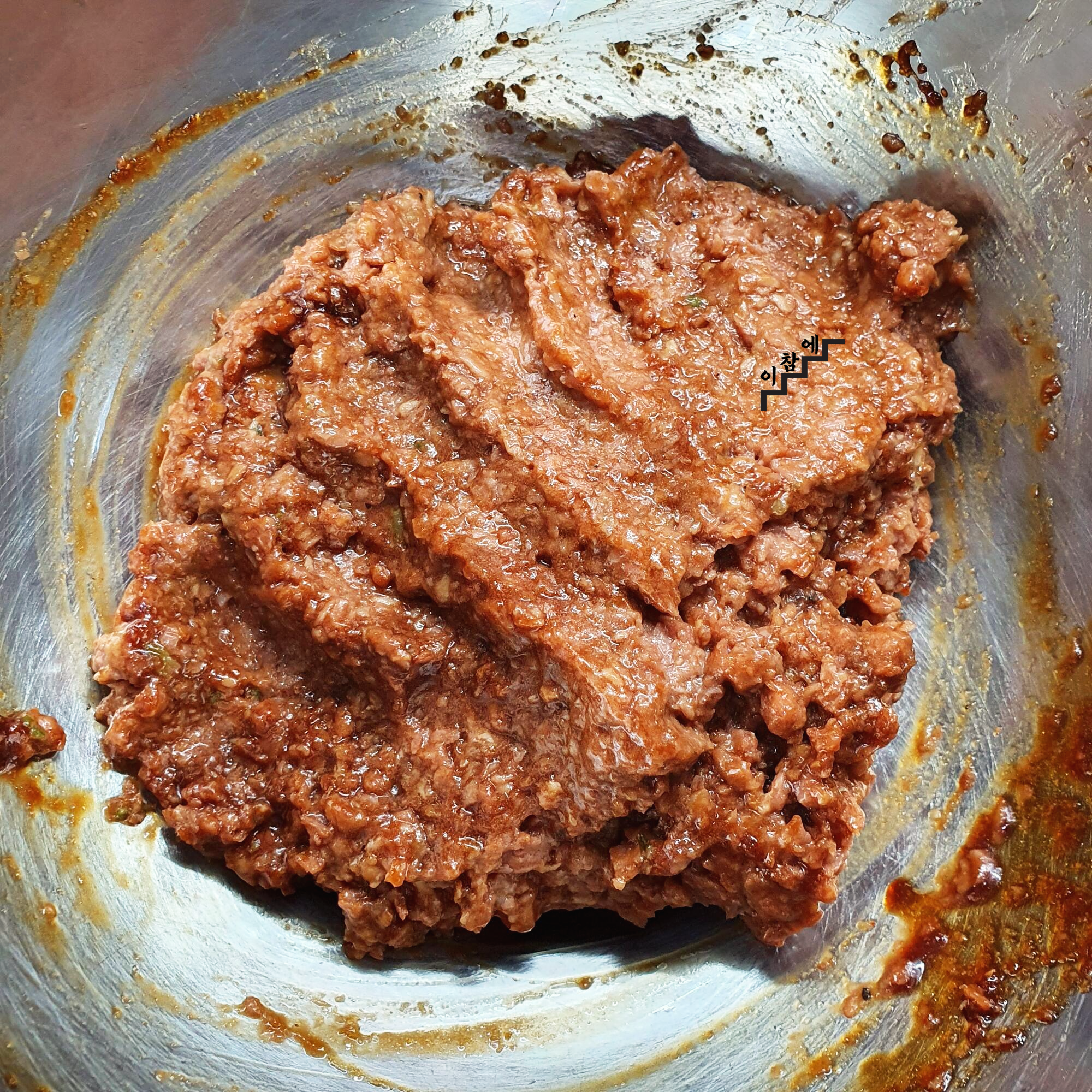 콩고기 넣어서 주물러 주세요.