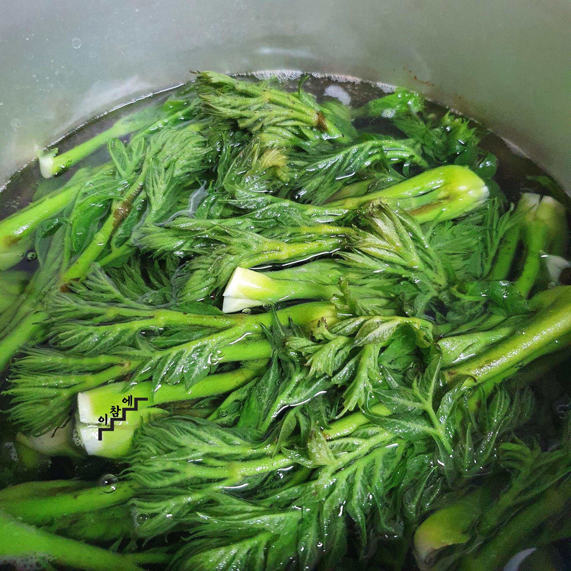 두릅의 두꺼운 부분을 먼저 넣고 1분 정도 삶은 후