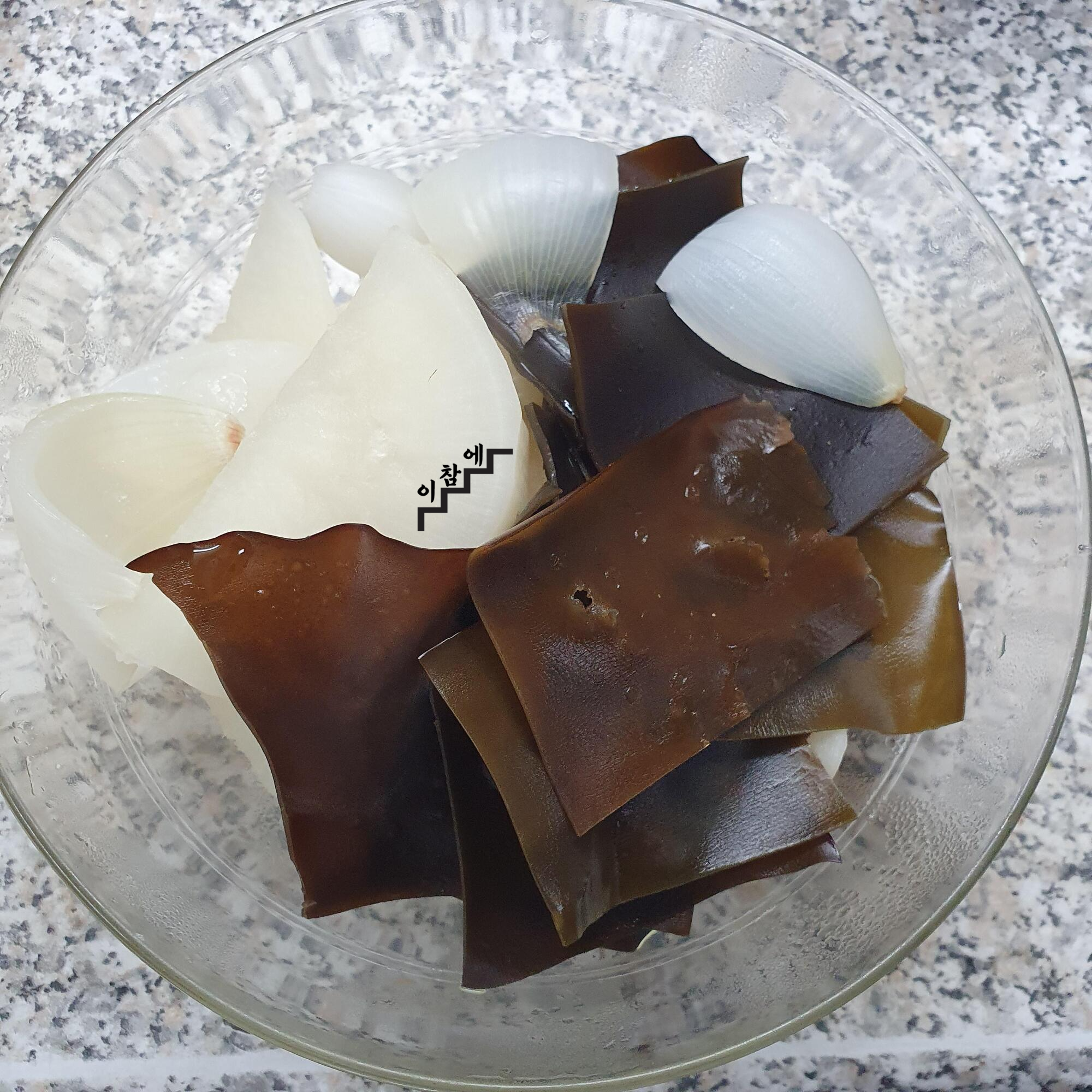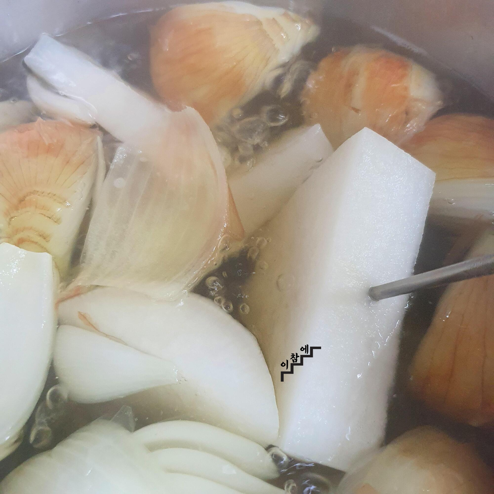 물에 무와 양파만 넣고 끓여줍니다.